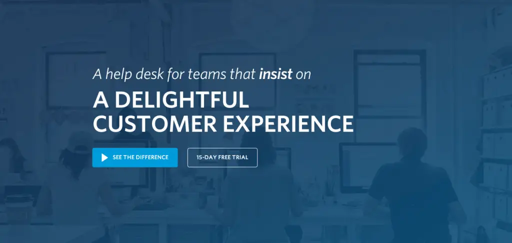 An example of a reversed headline by HelpDesk. Together, these form a single sentence, but the headline is “A Delightful Customer Experience” and the preceding phrase is the sub-headline.
