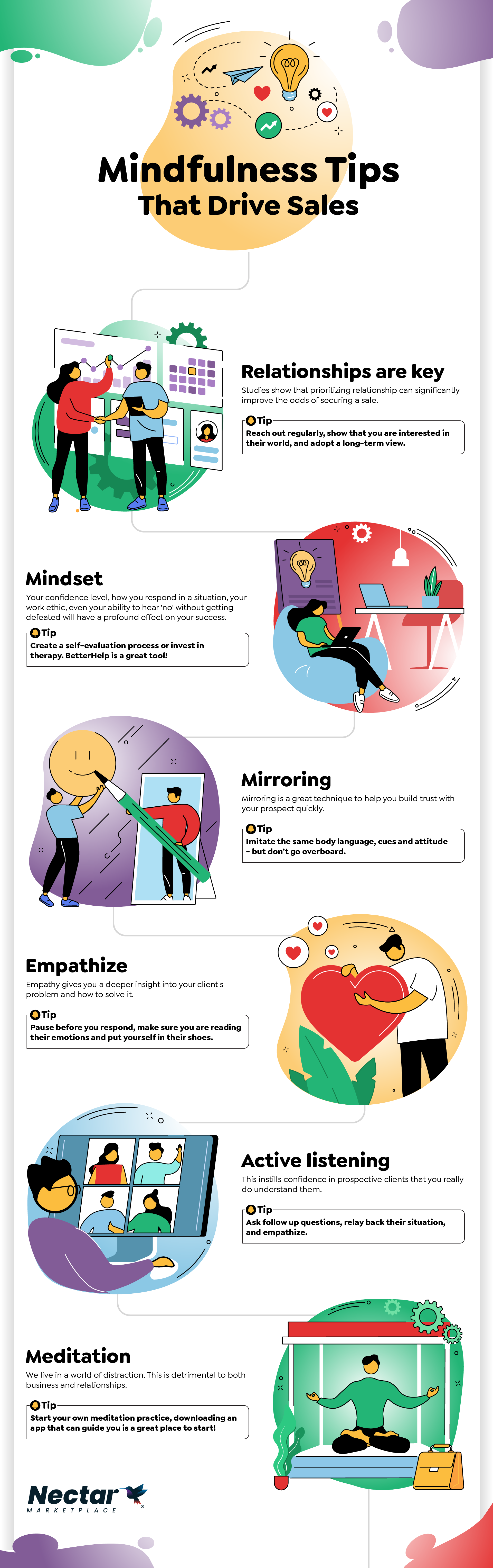 Nectar Marketplace recently put together the best mindfulness tips for sales professionals that will help those in your sales department decrease personal stress, drive sales and promote client retention.