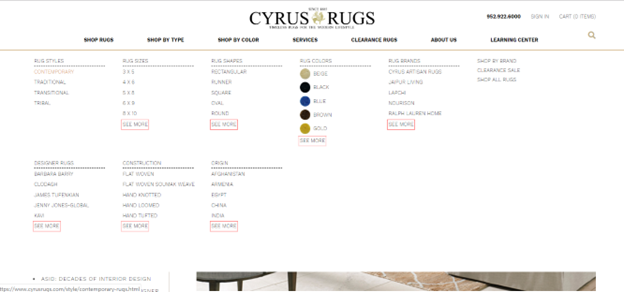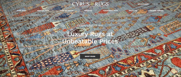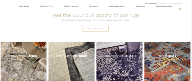 The above the fold section in the above screencap contains a tagline that says the brand offers luxury rugs at a price the customer can afford. There is also a link to the navigation bar that redirects to products sold at discounted prices. On the upper-right section, the contact details are also visible, making it easy for the customer to get in touch.