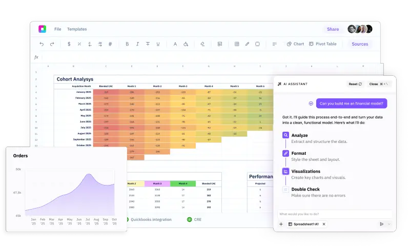 Sourcetable’s autopilot mode can complete a wide range of complex tasks that typically require advanced spreadsheet knowledge, including creating and editing financial models, generating spreadsheet templates, building pivot tables (something Google Sheets’ AI struggles with), cleaning data, creating charts and graphs, editing formatting, enriching data, and analyzing entire workbooks. The AI can understand data context without requiring users to pre-select ranges, interpret multiple ranges across different tabs, work with messy data, and seek human clarification when instructions are unclear.